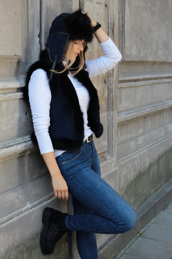 Obszyta futerkiem z lisa w kolorze czarnym.